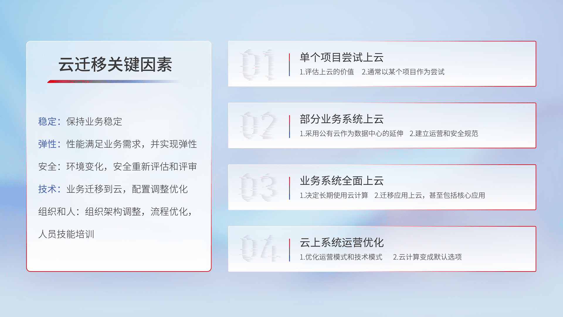 结合实际业务,,,,从规划设计、、、、云平台选型、、、、云原生改造、、、数据迁移、、集成交付,,迁移全过程为客户识别最佳上云路径,,,做好风险识别管理,,设计网络架构、、、、身份权限、、、、安全审计合规、、、、操作审计、、、、日志审计、、、监控告警策略、、、多站点容灾设计等,,对云上基础设施进行整体规划,,,,提升IT治理水平,,,以满足弹性、、高可用、、、高性能的需求。。。