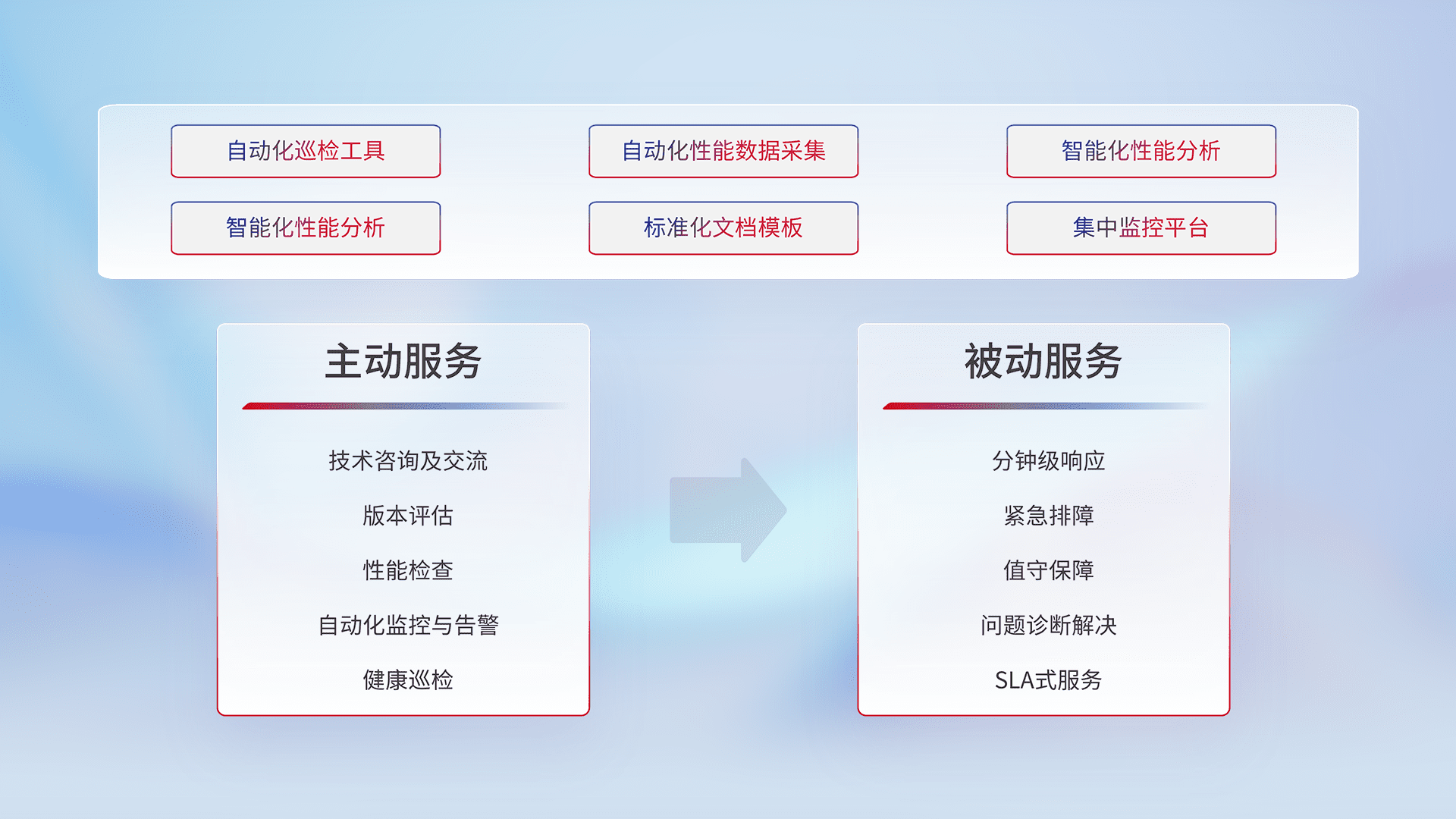 智能化工具和标准化文档,,,保障服务质量,,提供主动服务(包含技术咨询、、、、版本评估、、、性能检查、、、、自动化监控与告警、、、健康巡检)和被动服务包含(分钟级响应、、、、紧急排障、、、值守保障、、、问题诊断解决、、、SLA服务)。。。