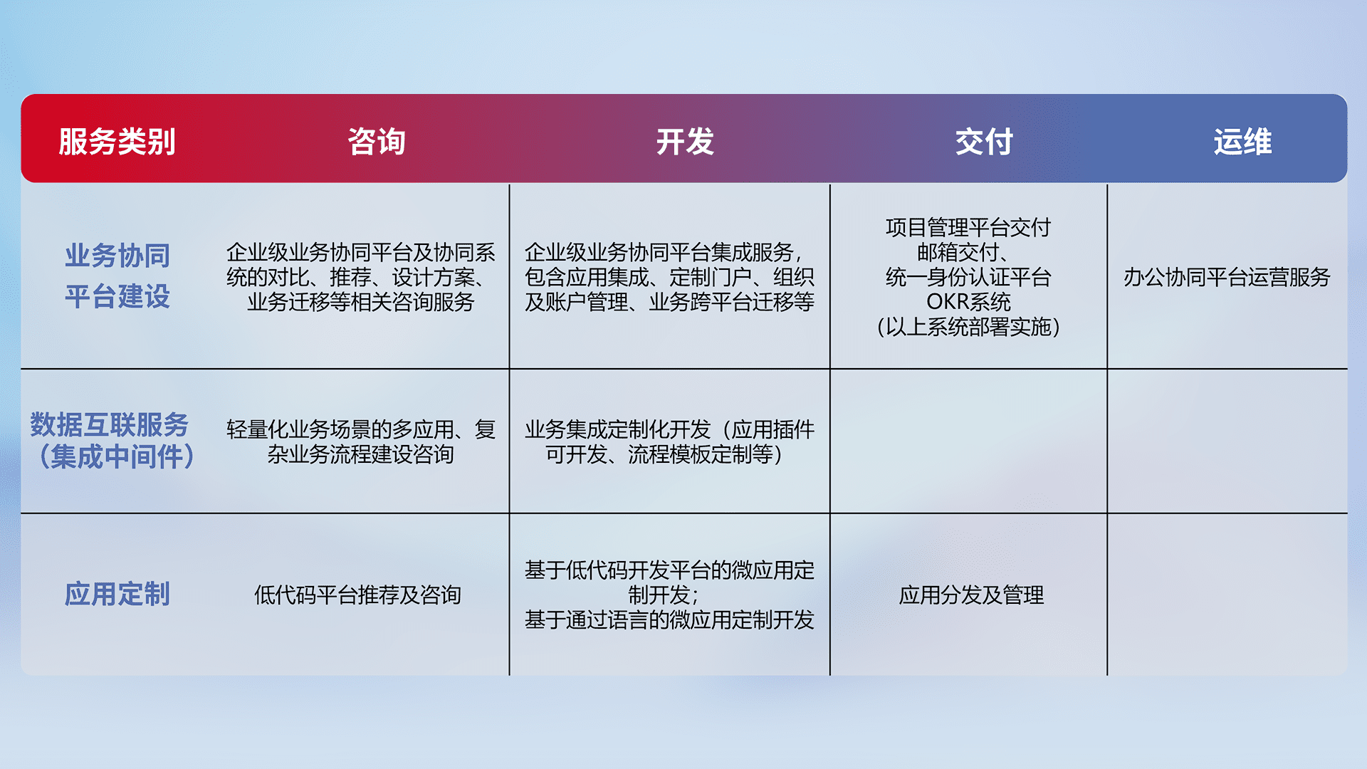 针对钉钉、、企微、、、IDaas等平台级产品提供产品的规划、、、方案、、、、交付、、、定制化开发等服务,,,,实现如统一协同办公、、、智能客户服务、、混合会议管理、、、智能数据查询、、、等业务场景,,,,实现数字化转型。。